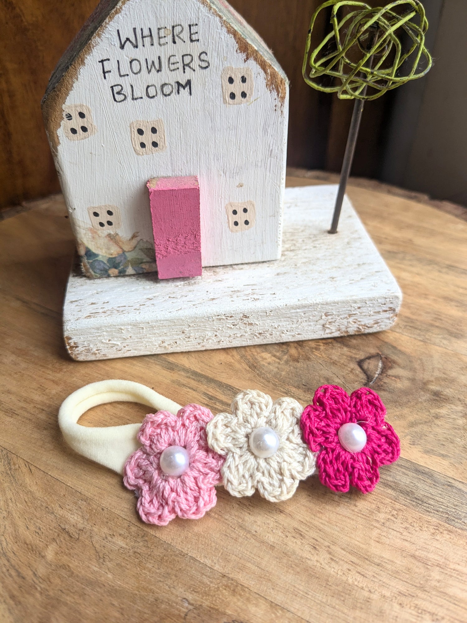 - Crochet flowers with pearls arranged together on a cream colour headband.