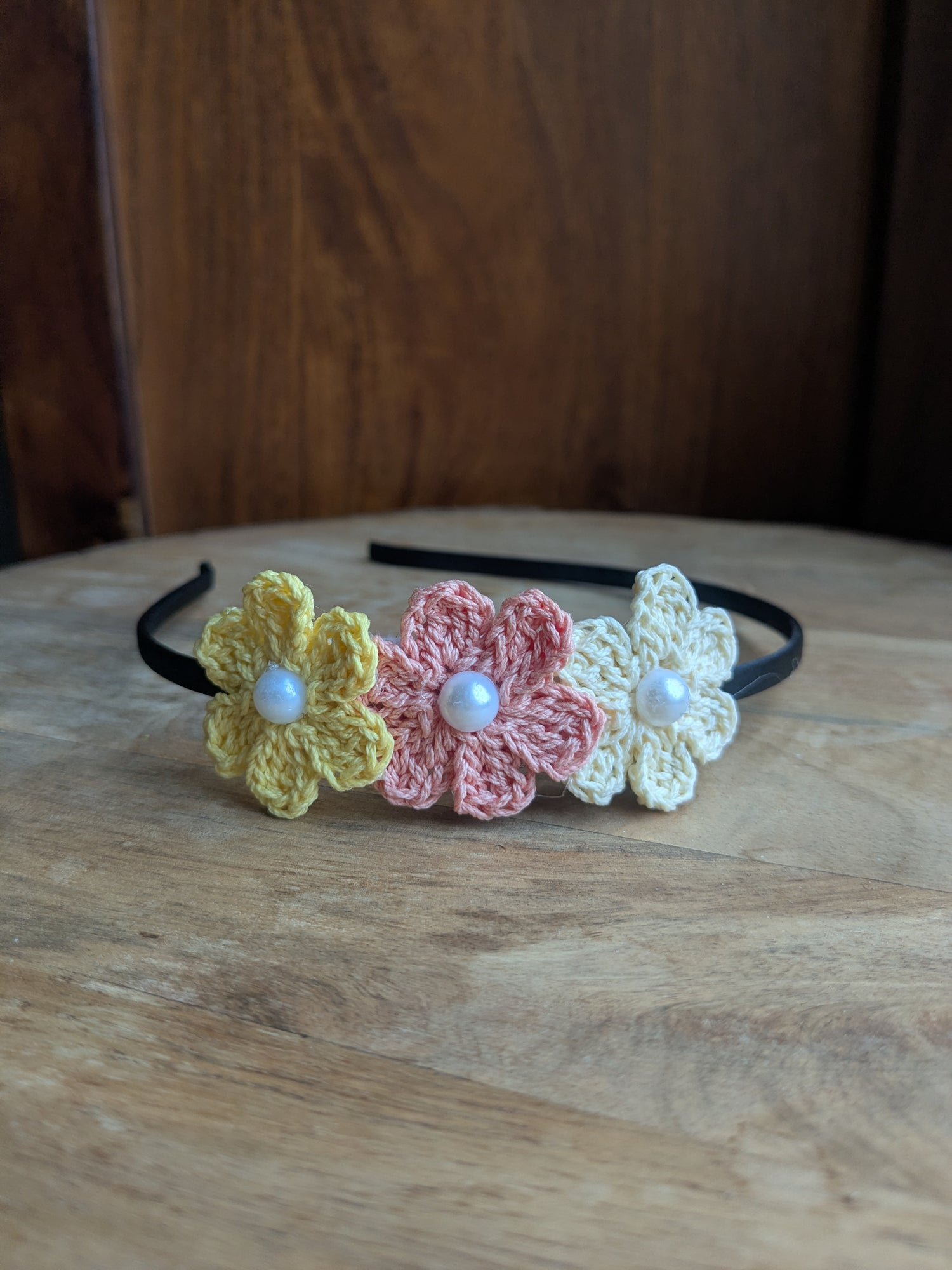 - Crochet flowers in yellow, peach and cream with pearls on a peach hairband.