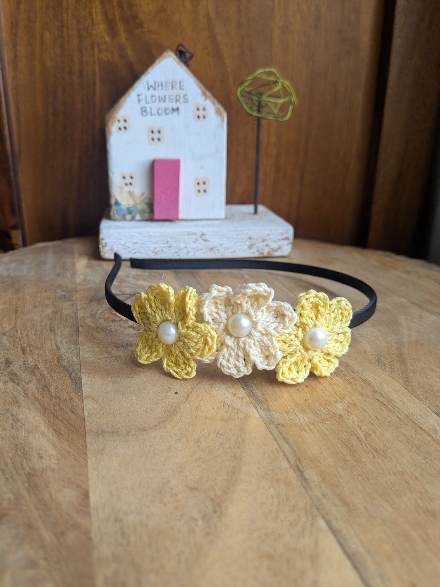 - Crochet flowers in yellow and cream with pearls on an black hairband.